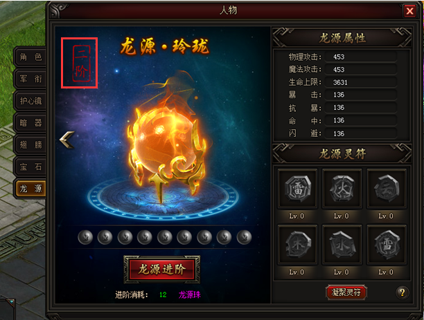 三、激活龙源后可进阶龙源,每次进阶龙源需要消耗一定数量的龙源珠,进阶成功后可增加1颗星,以及增加大量人物属性。