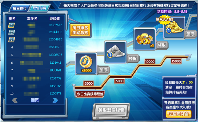 在活动期间每日参与比赛获得经验,既有海量奖励免费拿,每日都能获得黄金赛车心愿券哦!