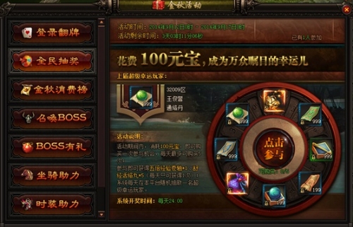 活动期间玩家仅需要在活动面板上消耗100元宝即可获得一次抽奖机会,每个角色每轮最多可参与5次。无论是否抽到奖励都可获得保底大奖。每天24:00开奖,参与次数越多,中奖几率越大!
