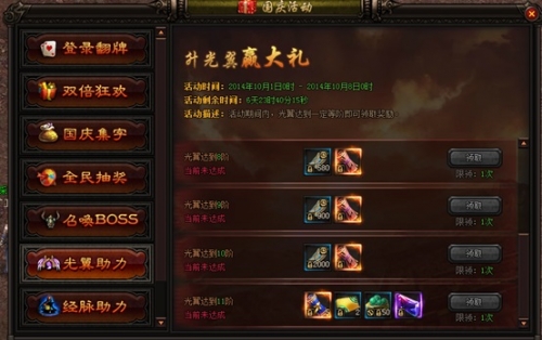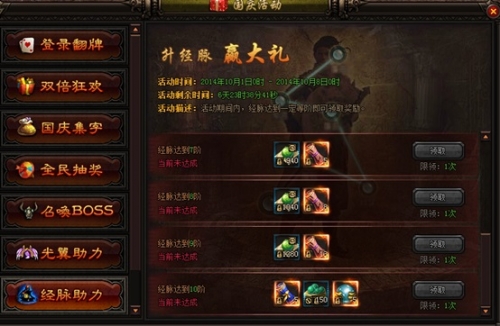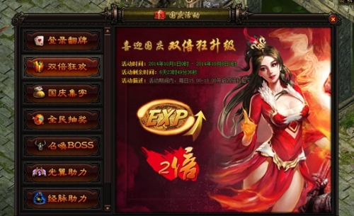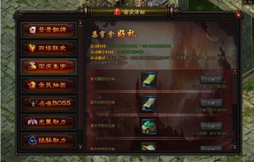 活动期间野外怪物会掉落国庆活动字符,集齐一定的字符可在面板上兑换超值奖励。