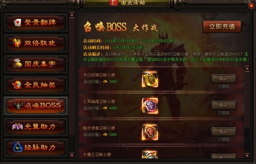 活动内容:活动期间可使用元宝购买特殊BOSS召唤令牌,使用令牌即可召唤BOSS