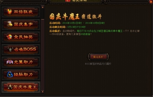 活动内容:活动期间每天15:00会在沙城密道刷新一只国庆牛魔王,击杀后必掉一件60级装备,有几率掉落65级装备。