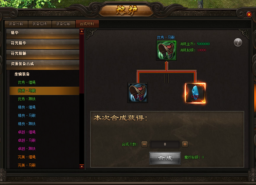 熔炉中添加了资源装备合成的选项,可以使用低阶的装备合成高阶的装备,每次合成消耗万能精华,万能精华可以在商城中购买。