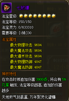 法宝提升至8星,等级上限提升至150级,可通过法宝系统里的法宝升星进行升级提升。法宝提升至8星需消耗2个7星法宝、50个神器灵胚、200万灵力及8000万金币。